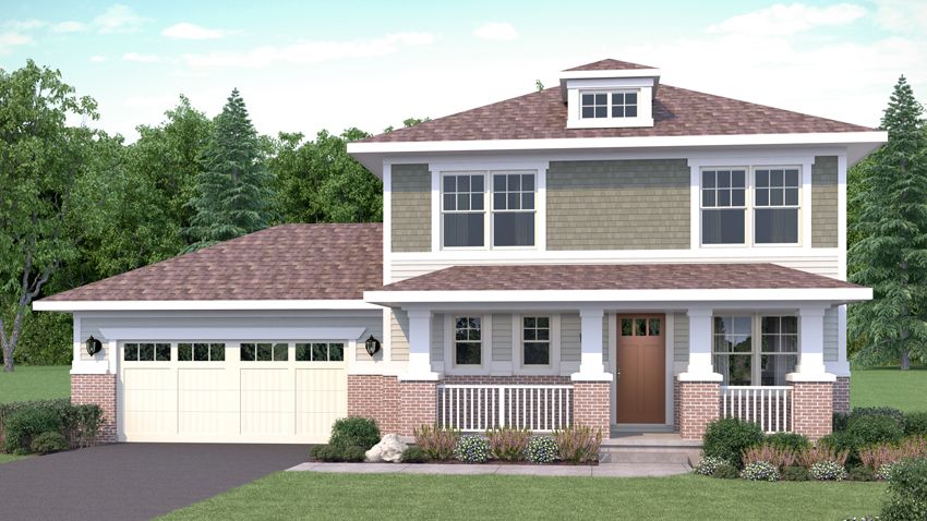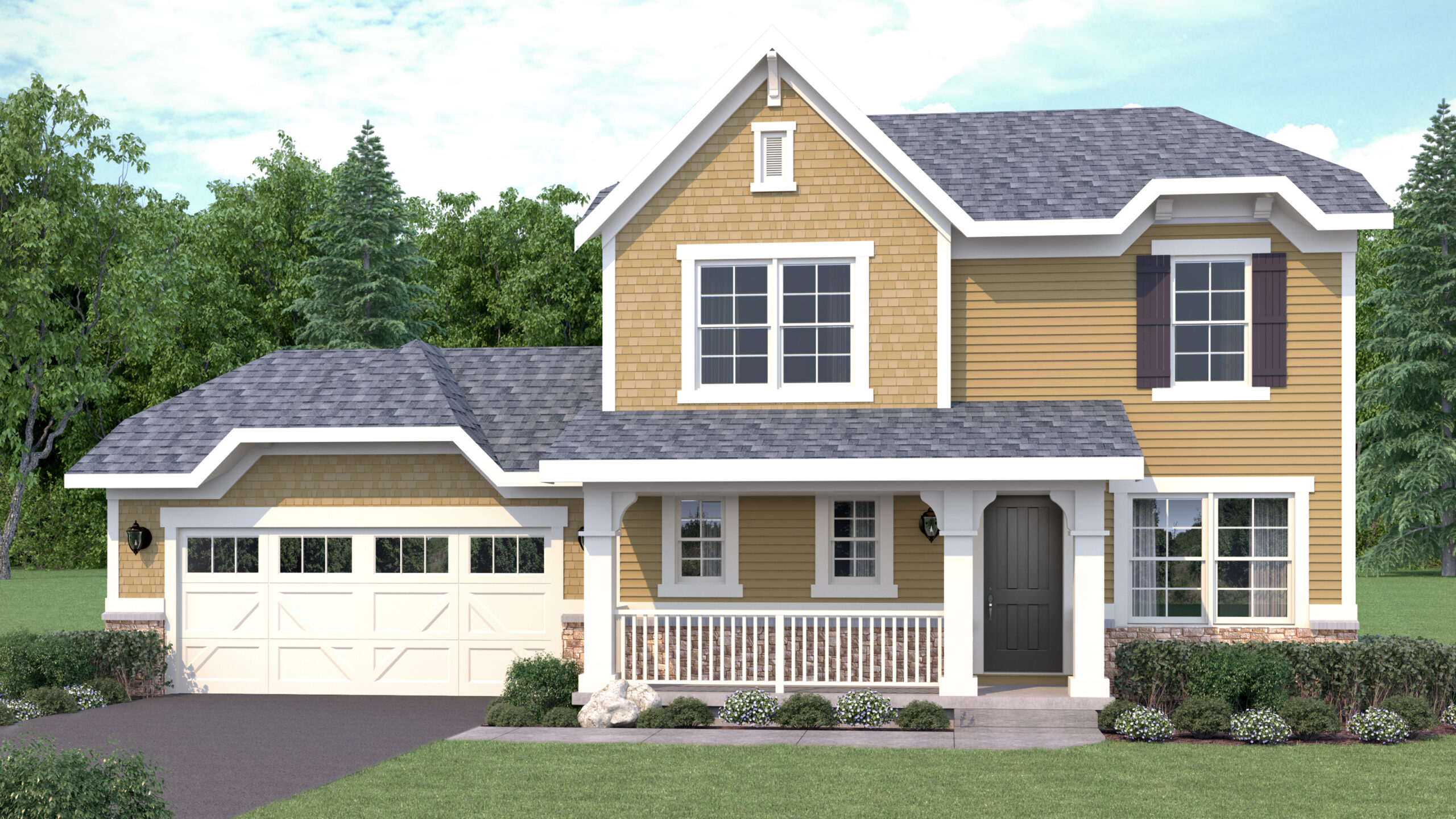 Exterior Rendering of Silver Birch floor plan from the front. 2 stories, 3 beds, 2.5 baths. Northern Craftsman exterior style. Northern Craftsman